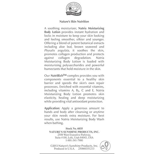 КомплексNatriRichTM включает в себя компоненты, необходимые для защиты здоровой кожи, и ускоряет протекающие в ней естественные восстановительные процессы, способствуя правильному функционированию ее клеток. Обогащенное комплексом жизненно важных витаминов, в том числе А, В5, С и Е, увлажняющее молочко для тела Natria делает кожу здоровой, упругой и эластичной, глубоко питая и увлажняя ее, а также обеспечивая надежную антиоксидантную защиту Вашей кожи.