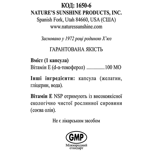 Состав - 1 капсула: витамин Е (d-альфа-токоферол) - 100 ME (100 мг - 111% от АСП).